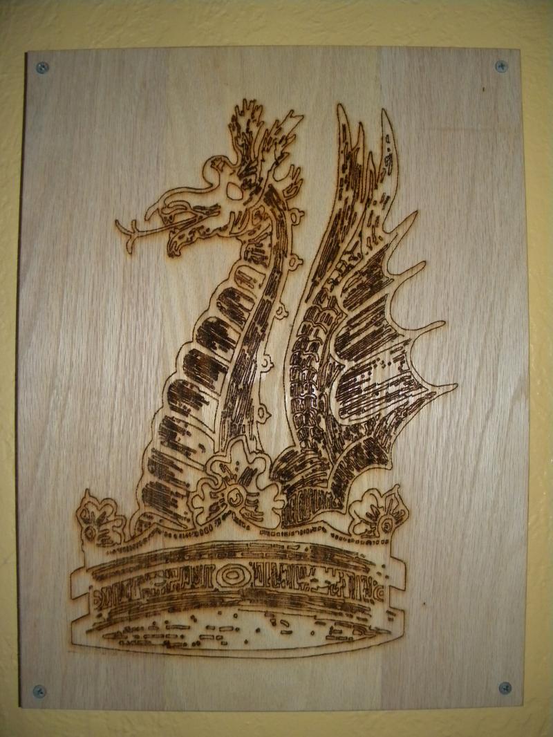 We took an original design of a family crest, scaned and modify it to be able to be laser cut on a 3/4 inch thick piece of wood. The original drawing was about 1"x1.5" and we had enlarge it to fit a 8-1/2"x11" sheet of paper. Look to the right, for a before and after picture.